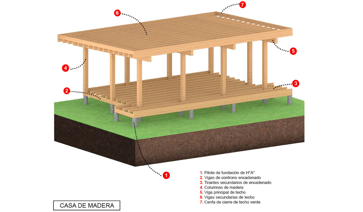 Nuestras estructuras incorporan elementos clásicos de construcción como cerchas, postes y vigas entrelazadas para soportar cargas, configurar separaciones con tableros OSB y realizar montajes estructurales.
